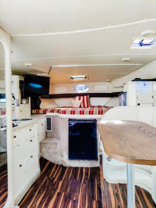 Accommodations include a VacuFlush toilet, sink/vanity. The cockpit layout is great for entertaining with abundant adult-size seating, a wet bar, useful counter space and refrigerator all just aft of the helm seat.